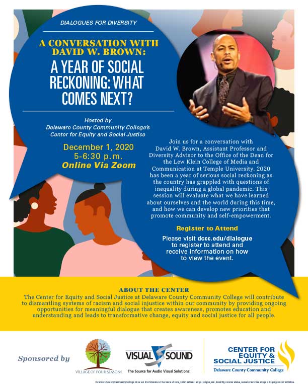 Join us for a conversation with David W. Brown, Assistant Professor and Diversity Advisor to the Office of the Dean for the Lew Klein College of Media and Communication at Temple University. 2020 has been a year of serious social reckoning as the country has grappled with questions of inequality during a global pandemic. This session will evaluate what we have learned about ourselves and the world during this time, and how we can develop new priorities that promote community and self-empowerment.