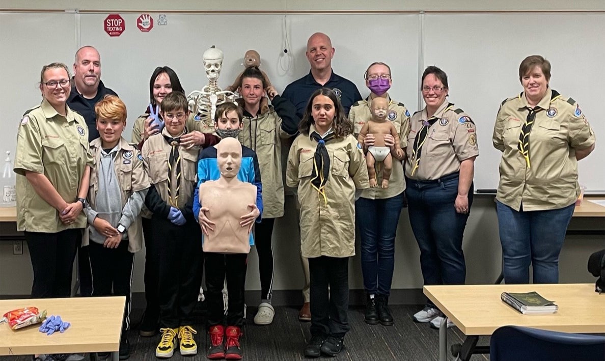 (Delaware and Chester Counties, PA • April 7, 2022)—Delaware County Community College Emergency Services Education instructors hosted Glenolden Scout Troop 44 during an evening visit to the College’s Marple Campus on April 5. EMS Instructor Gary Thompson and Emergency Services Education Director Chris Millay, both scouts at one time themselves, assisted the Troop 44 scouts in obtaining their First-Aid merit badges. The instructors taught the scouts what to do in an emergency, CPR, what to do when someone is choking, as well as basic first aid.